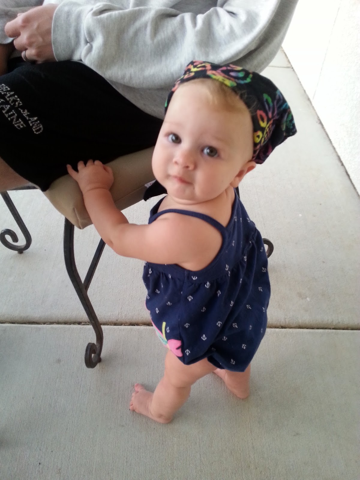 - (Beginning of August) So close to walking. Stands up on her own and tries to step forward. She does make steps forward when holding onto the coffee table or onto our hands.